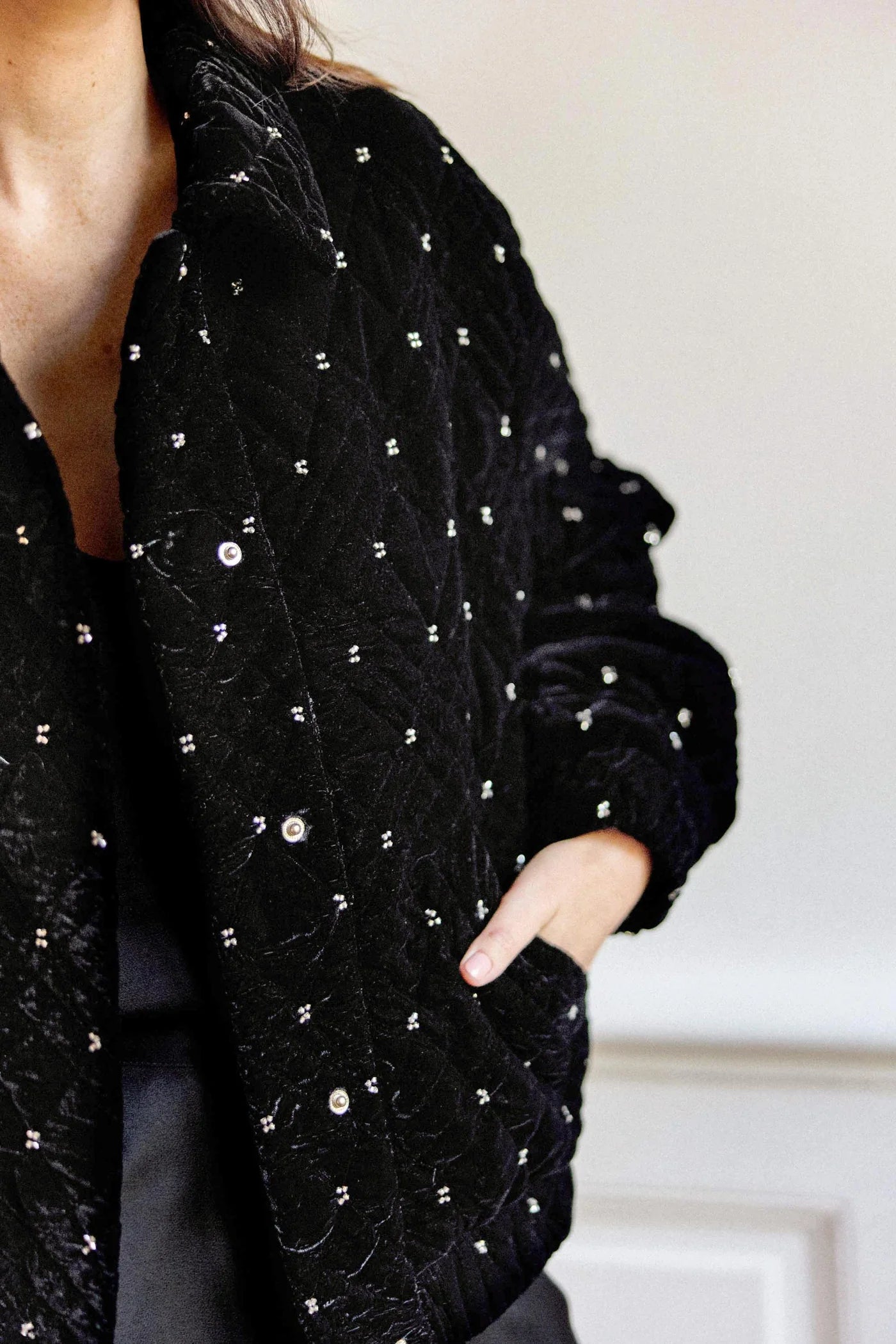 Vany, un blouson teddy en velours matelassé orné de perles, avec patte de boutonnage à pressions, finitions élastiquées et poches raglan, pour un look moderne et élégant.