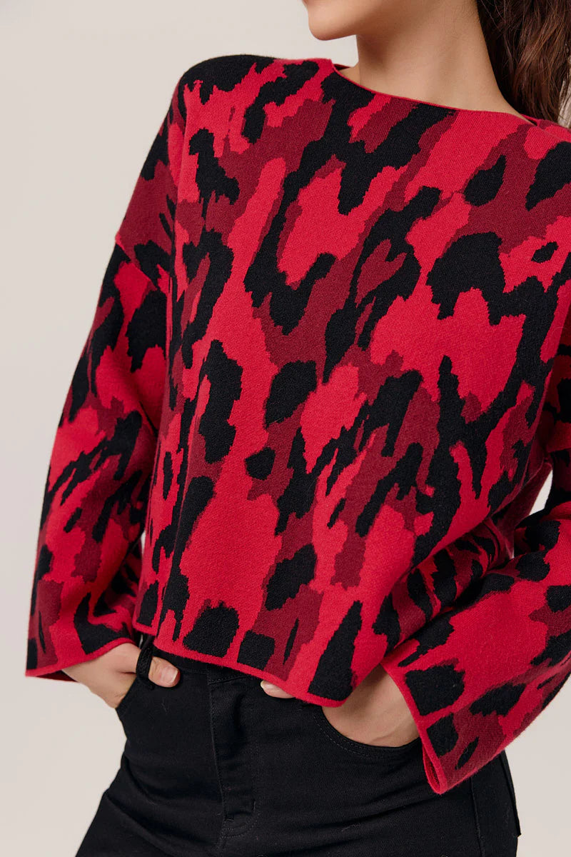 Pull ample à col bateau, imprimé graphique contrasté et manches longues évasées. Un modèle qui combine audace et confort.