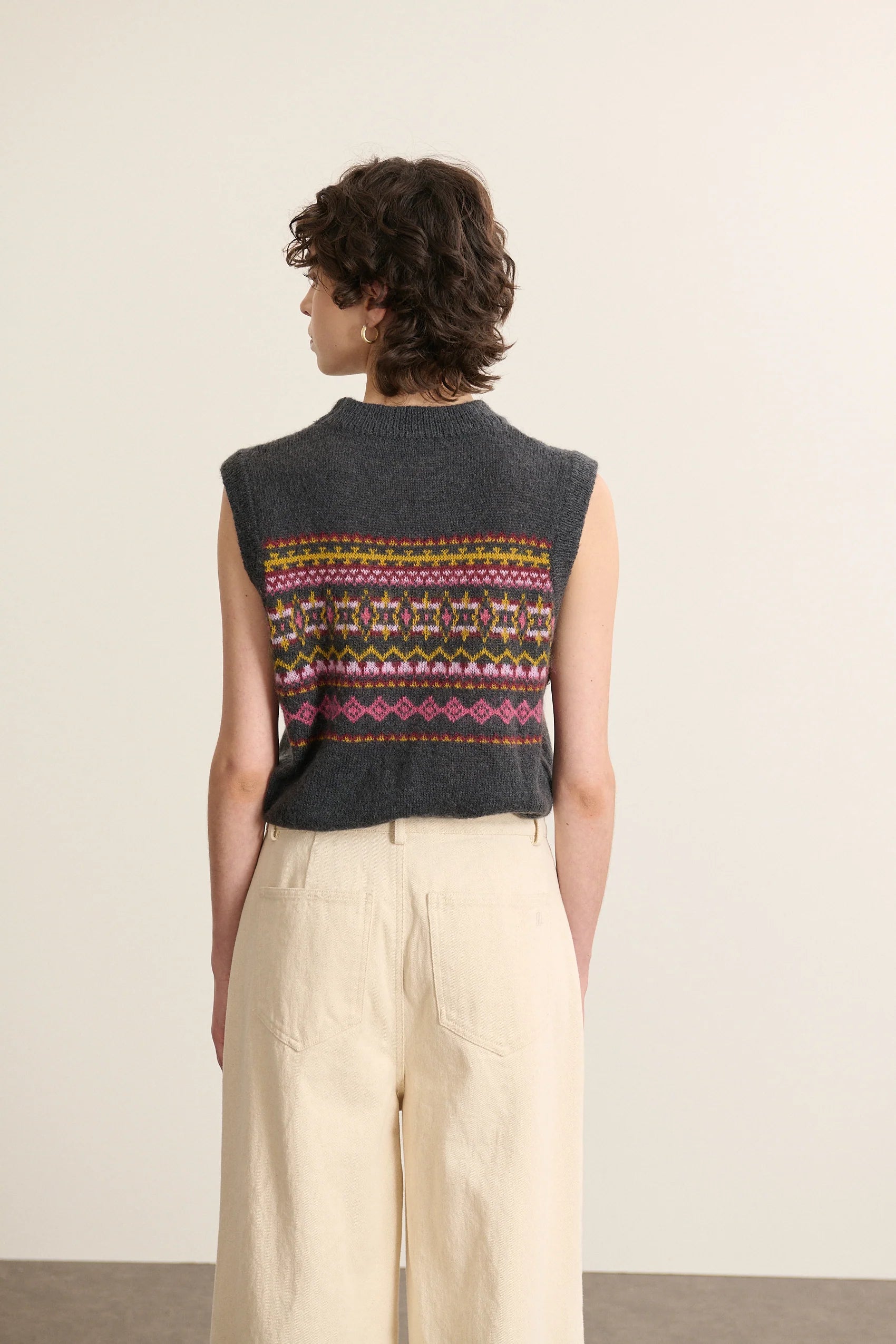 BIBI est un pull sans manches en maille jacquard d'inspiration nordique, décliné dans un ton anthracite profond. Un motif graphique qui apporte du caractère à une silhouette simple. Confectionné dans un mélange de laine mérinos et de kid mohair, il offre une maille douce et chaude, idéale à porter à même la peau.
