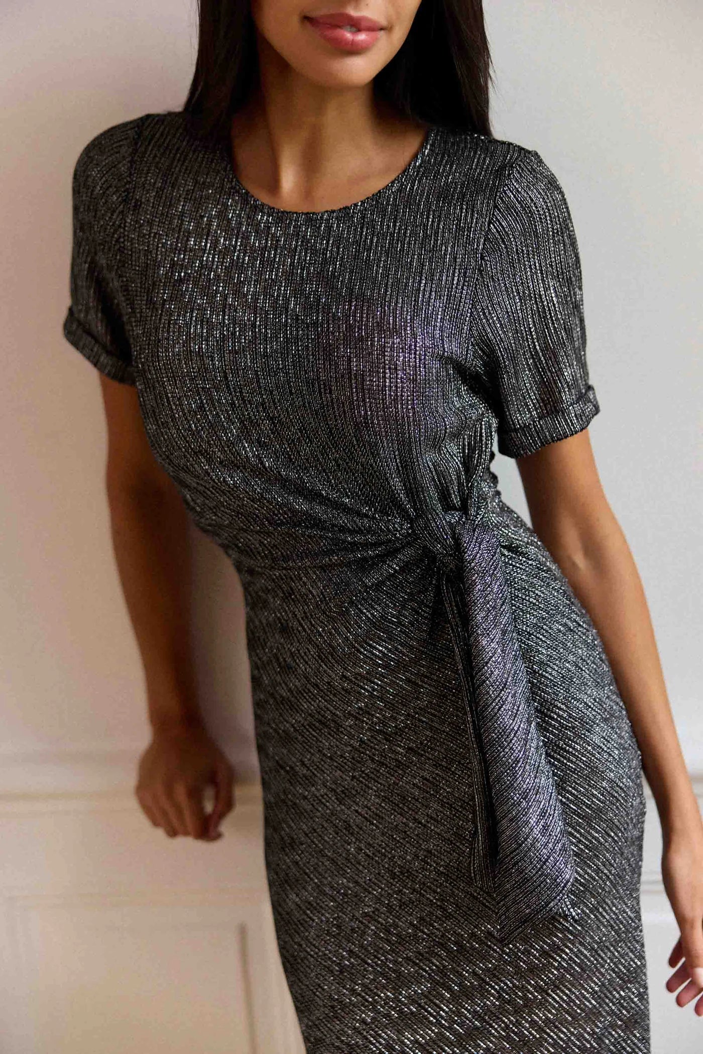 Ruslan, une robe midi en matière lurexée argentée, avec encolure ronde, lien à nouer à la taille et fente devant pour un look féminin.