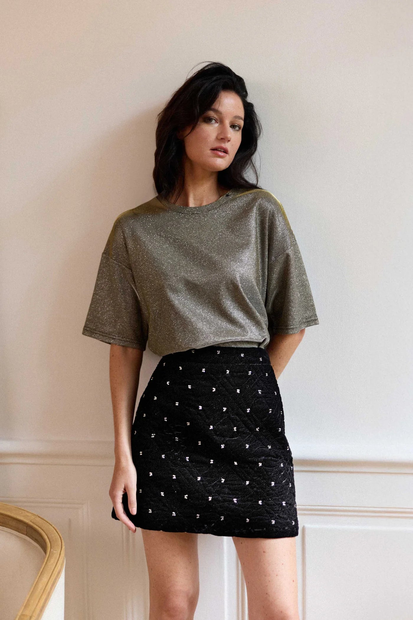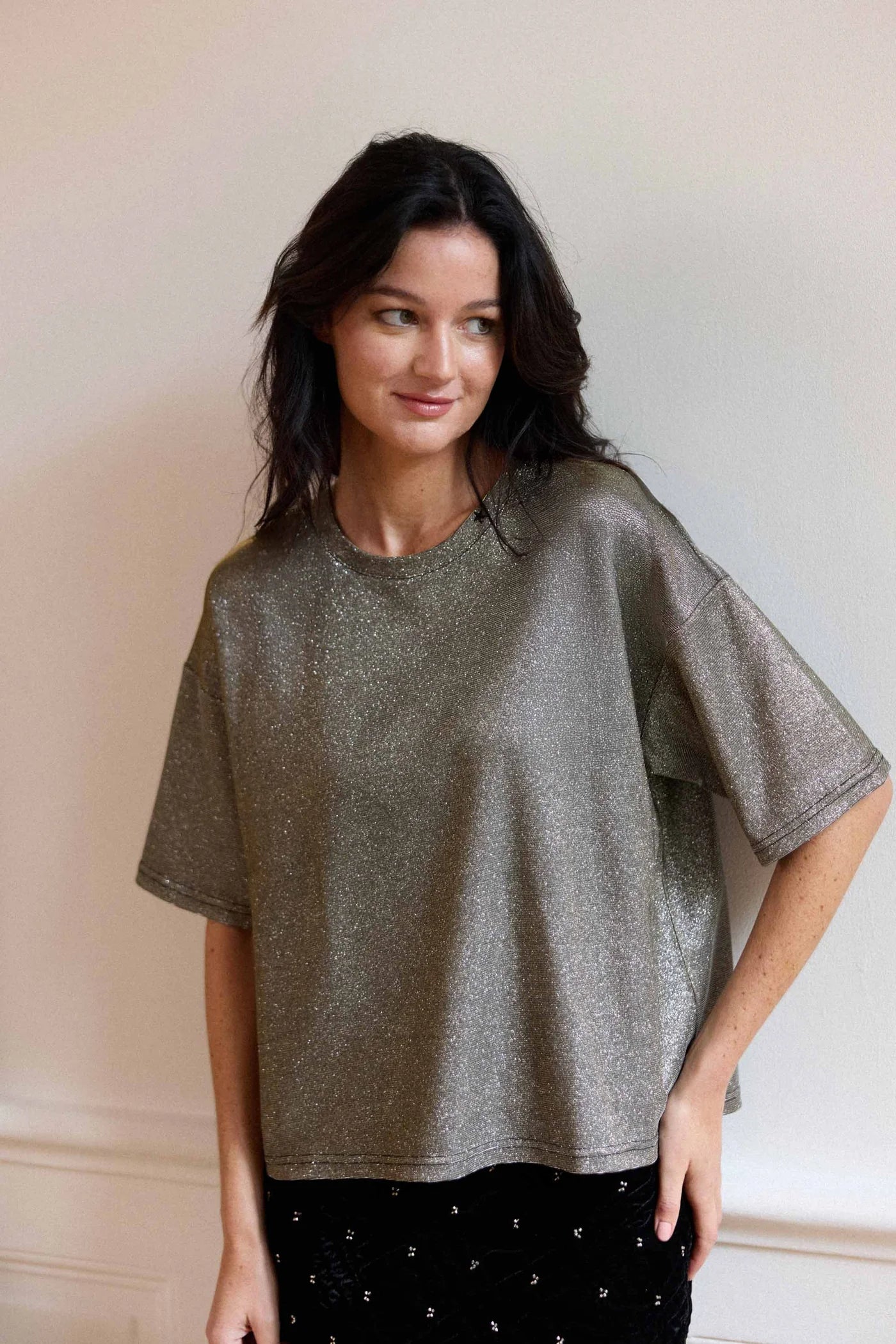 Tais, un t-shirt oversize en maille lurexée argentée, avec col rond, manches courtes et broderie étoile dorée à l’encolure pour une touche lumineuse.
