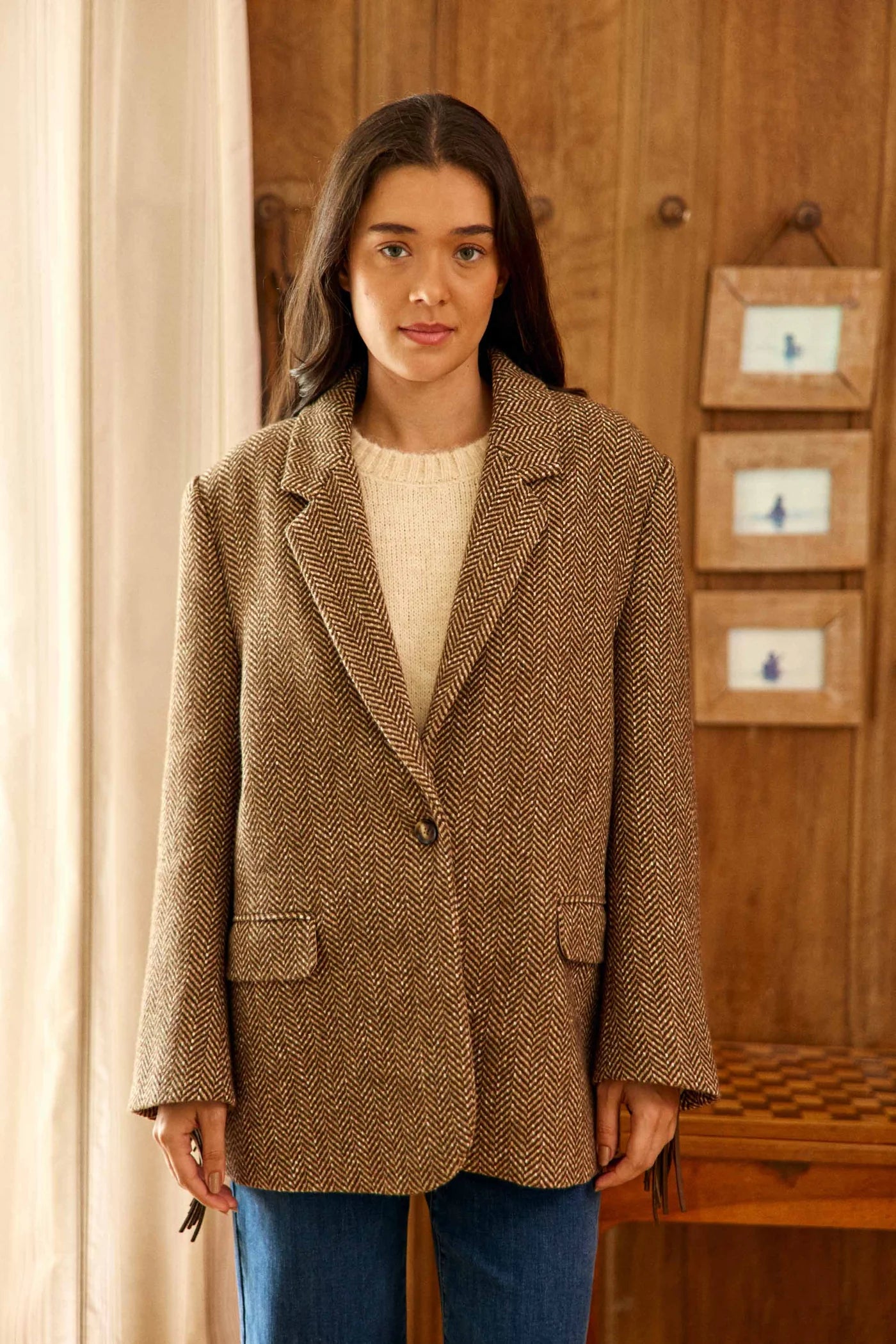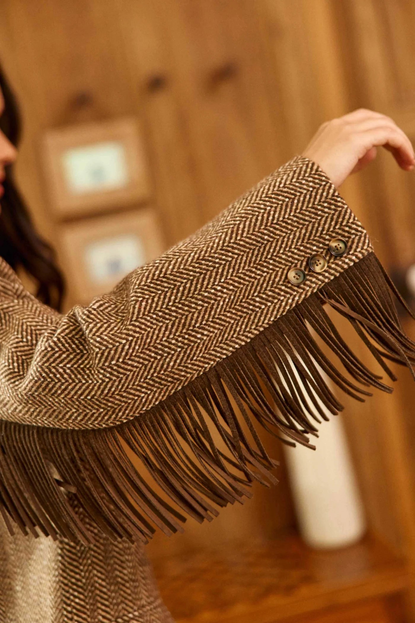 La veste Valyn adopte une coupe droite inspirée du tailleur, réalisée en tissage chevron avec des détails franges contrastées au dos et sur les manches. Elle présente un col tailleur, des manches tailleur, un boutonnage milieu devant avec bouton en corne et des poches à rabat sur le devant. Sa doublure associe rayonne et polyester pour plus de confort.