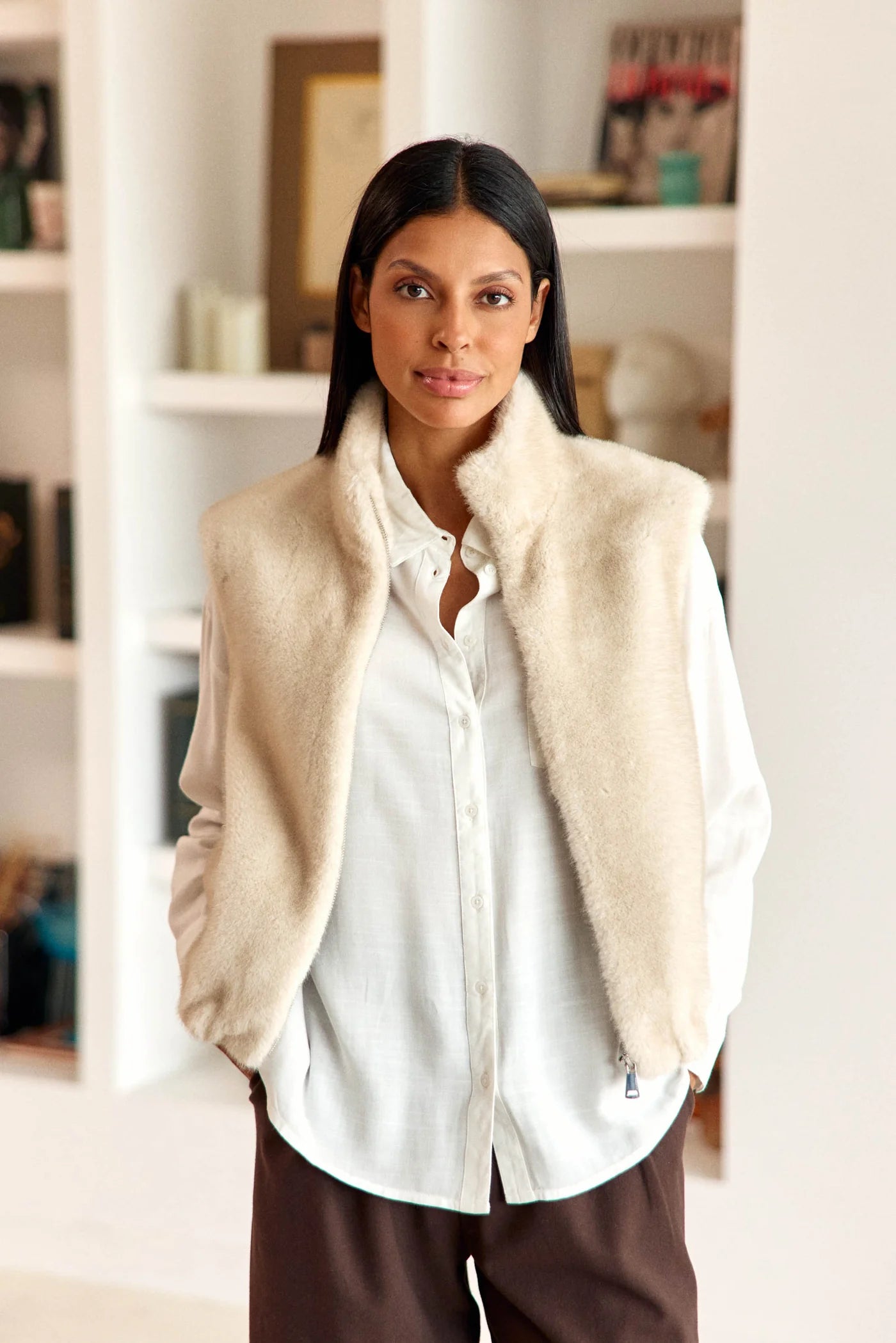 La veste Vemy en beige séduit par sa coupe sans manches et sa matière imitation fourrure, parfaite pour un style cosy et moderne. Elle est dotée d’un col officier et d’une fermeture zippée, alliant confort et praticité